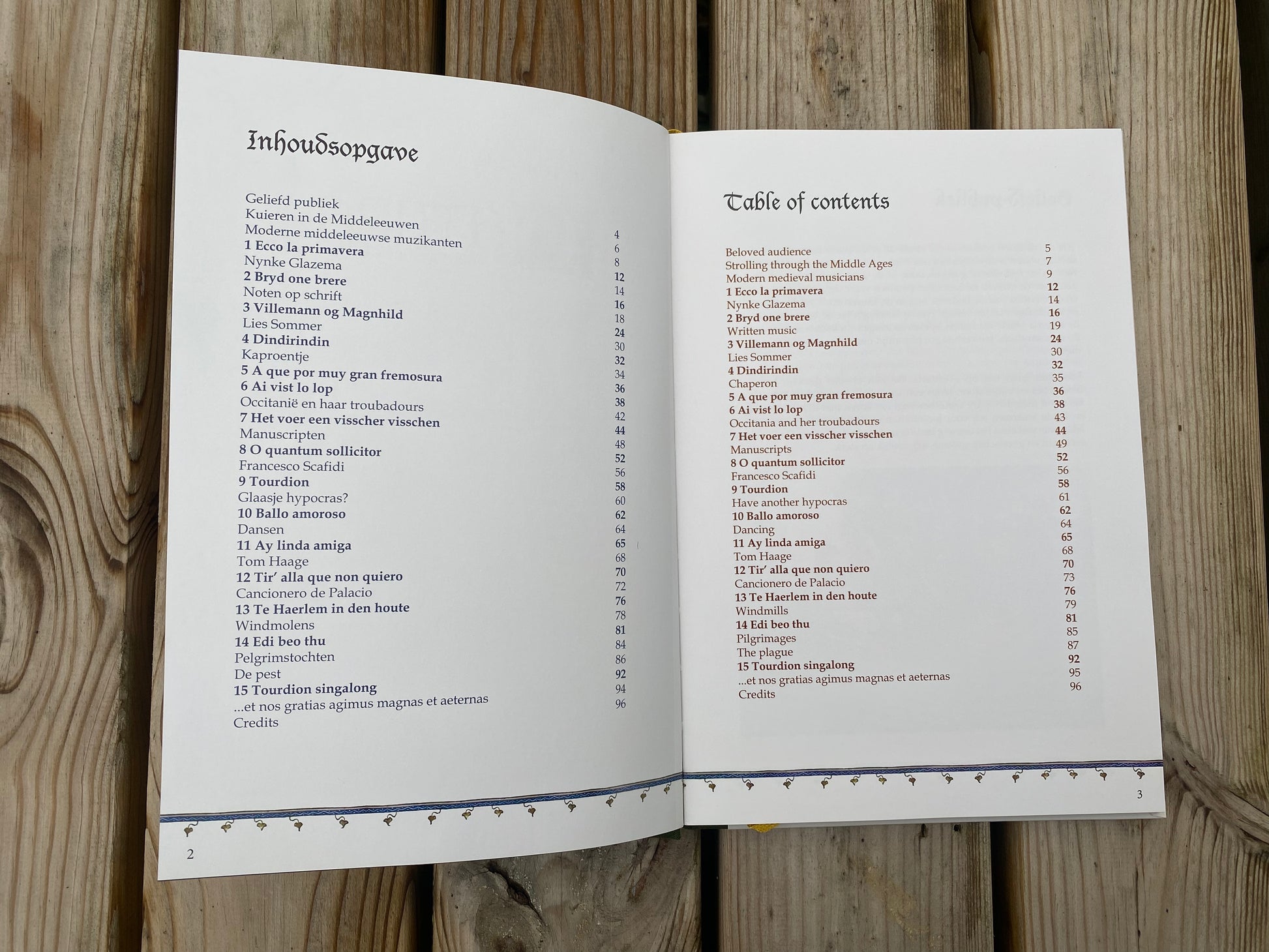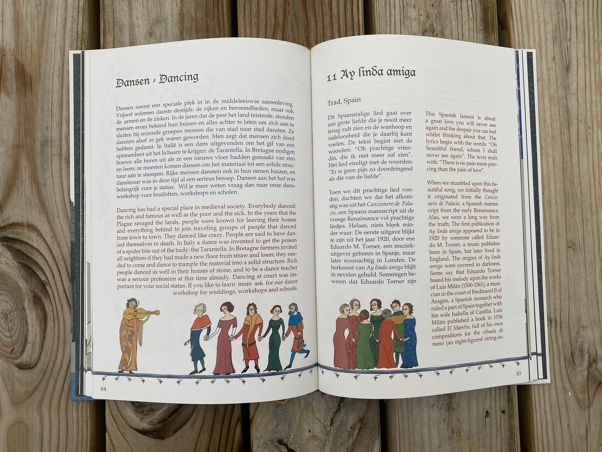 The book contains the songtexts from the songs on the cd, plus with each track an accompanying text with background information. We also added information about the most appealing subjects in the medieval era. Forbidden love, the plague, royal songbooks, the invention of the windmill and the whereabouts of a maiden-robbing troll. The will be aws and laughter, funfacts for friends and survivaltricks may you even end up in the Xvth century. Besides all this there is also a course in singing, our favourite recipe and our personal stories.